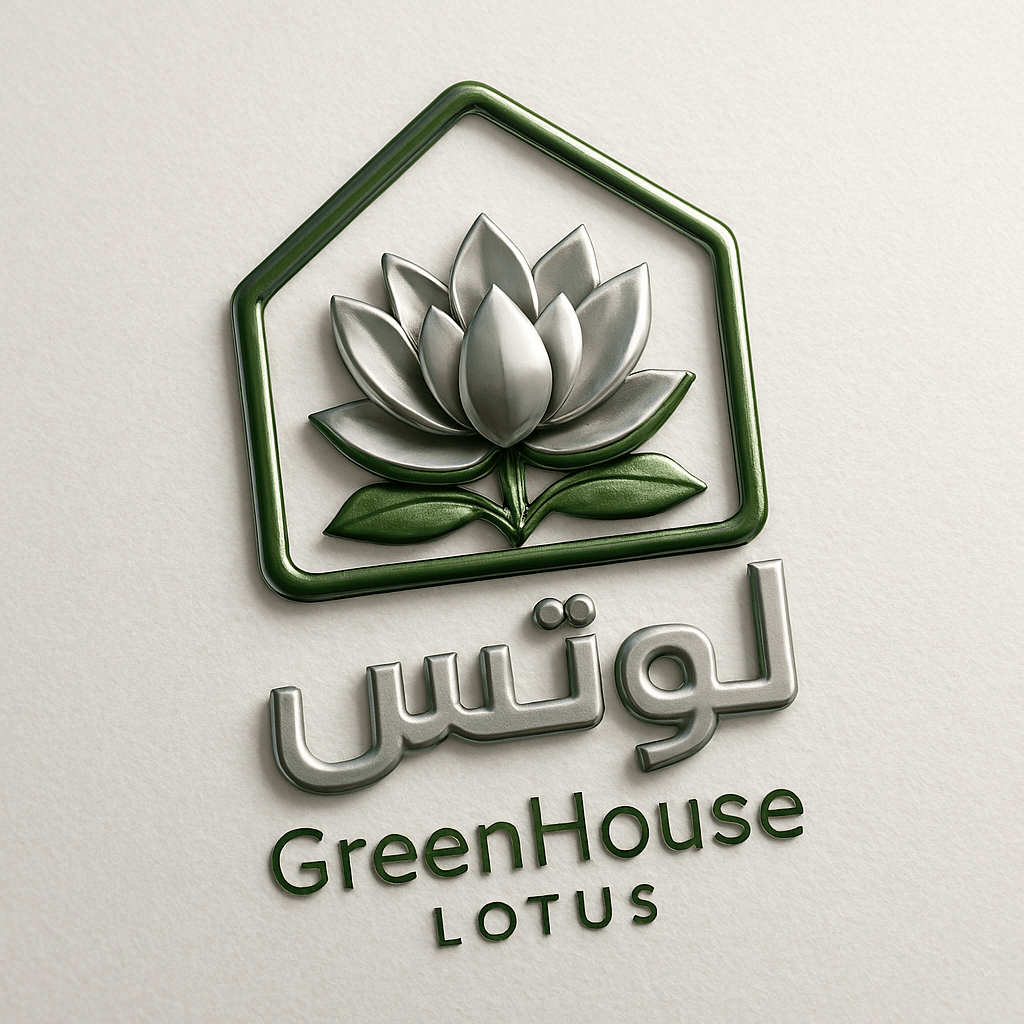 طراحی لوگوی اختصاصی برای برند "GreenHouse Lotus" با الهام از گل لوتوس و تلفیق آن با فرم گلخانه، با سبک سهبعدی و مدرن برای نمایش هویت بصری برند.