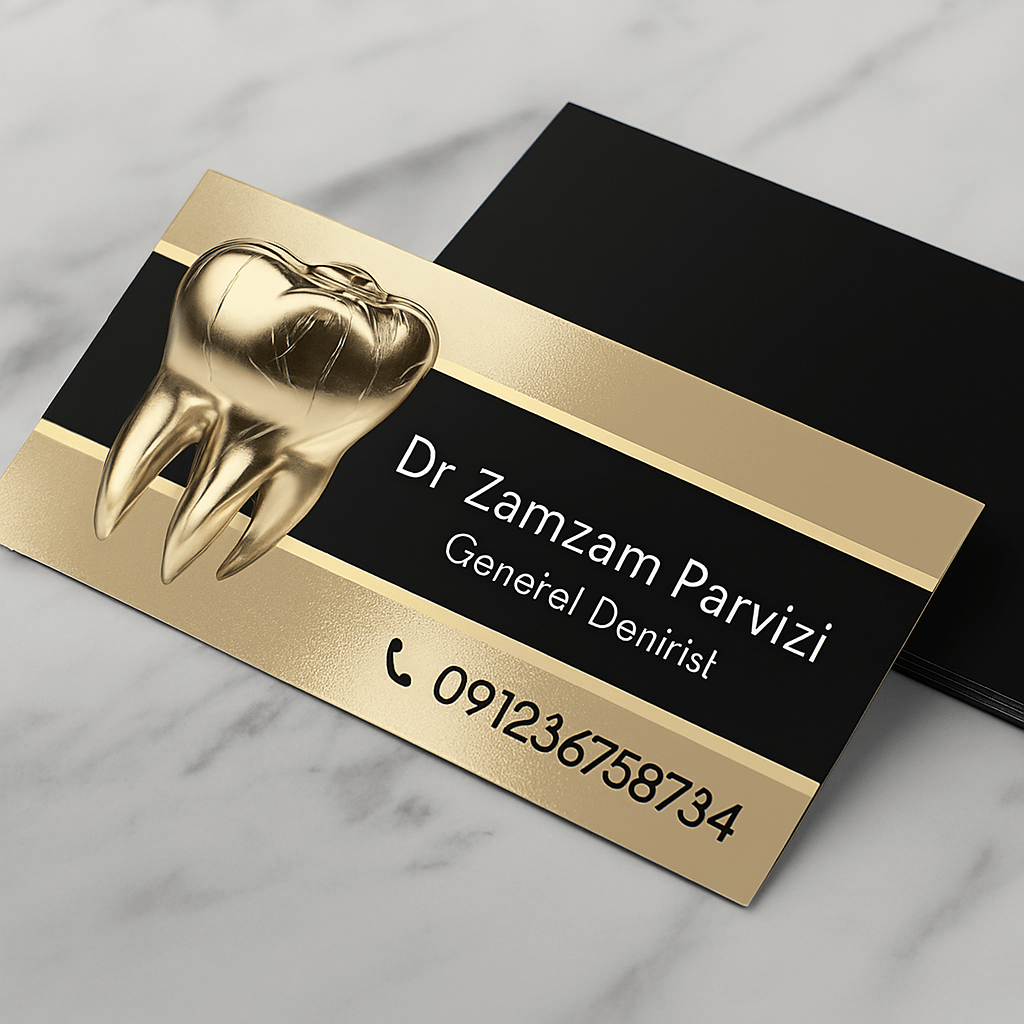 طراحی کارت ویزیت اختصاصی برای دندانپزشک با استفاده از المان سهبعدی دندان طلایی، ترکیب رنگ مشکی و طلایی برای ایجاد جلوهای لوکس و حرفهای.