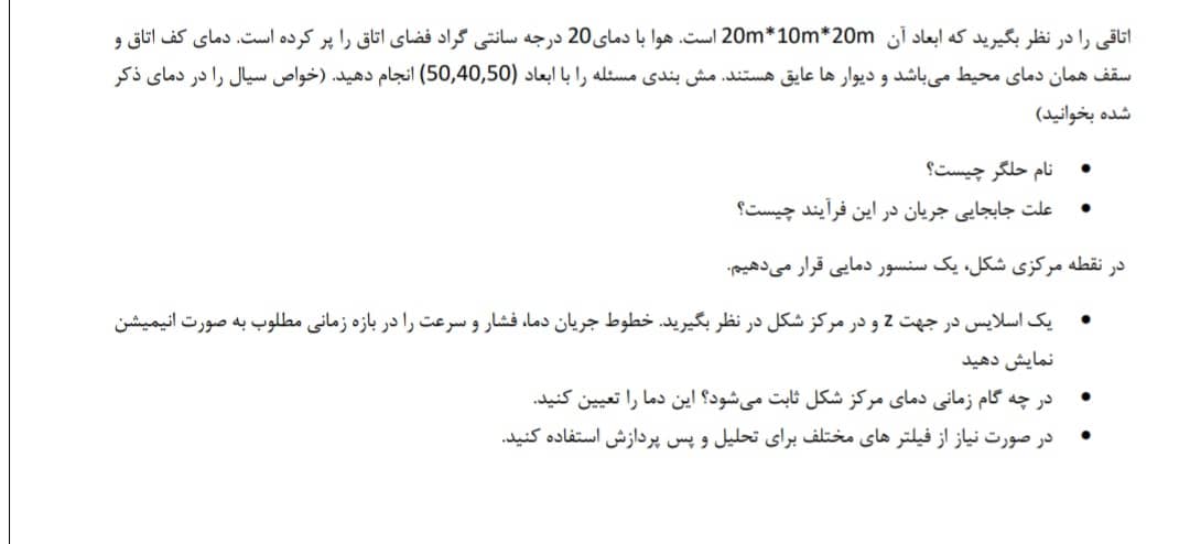 سلام وقت بخیر من پروژه اپن فوم داشتم ۱.توضیح مسئله، و نوع حلگر (آرام یا درهم ، تراکم پذیر یا تراکم ناپذیر ، چندفازی ... ) ۲.نحوه تولید هندسه (در صورت نیاز) و چگونگی ایجاد مش ۳.نحوه تعریف خواص سیال ۴.توضیح در مورد شرایط مرزی مسئله ۵.مروری بر روش های عددی و schem های مورد استفاده و در صورت نیاز بررسی آن ها ۶. بررسی نتایج با نگرشی بر پاراویو این هم داده های دیگش هستش ۱.توضیح مسئله، و نوع حلگر (آرام یا درهم ، تراکم پذیر یا تراکم ناپذیر ، چندفازی ... ) ۲.نحوه تولید هندسه (در صورت نیاز) و چگونگی ایجاد مش ۳.نحوه تعریف خواص سیال ۴.توضیح در مورد شرایط مرزی مسئله ۵.مروری بر روش های عددی و schem های مورد استفاده و در صورت نیاز بررسی آن ها ۶. بررسی نتایج با نگرشی بر پاراویو این 6 مورد رو هم میخواستم که انجام دهنده ی پروژه هر کدومشون رو دلیلش رو هم برام به صورت تایپی کامل بگن که داخل ارائه بتونم خودم بگم ممنونم فقط هزینه رو لطف میکنید چقدر میشه 0301