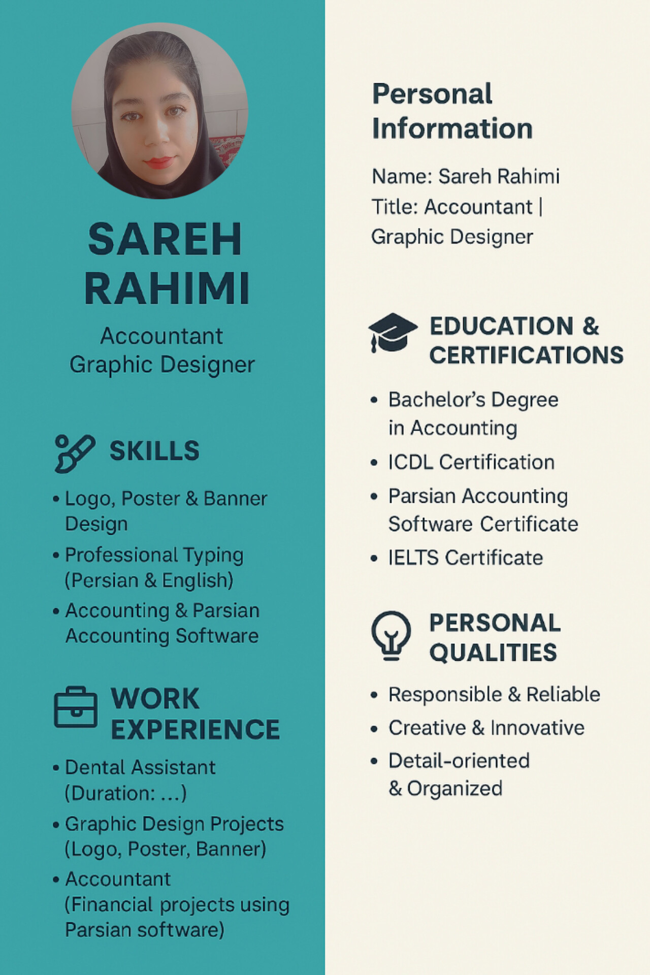 سلام وقتتون بخیر ساره هستم کارشناس حسابداری و طراح لوگو و پوستر در زمینه تایپ و طراحی ها تبلیغاتی هم فعالیت دارم لطفا رزومه بنده رو مشاهده بفرمایید در کمترین زمان ممکن و با بهترین کیفیت و نازلترین قیمت پروژه های شما رو انجام میدم