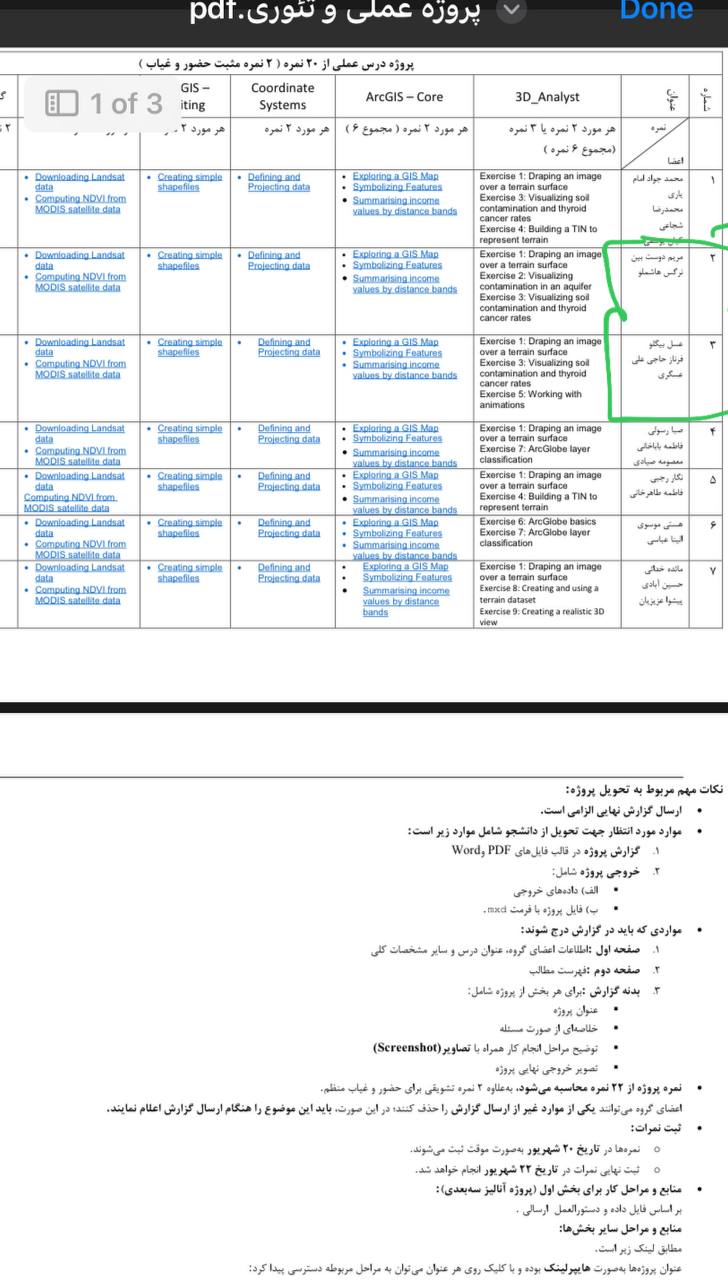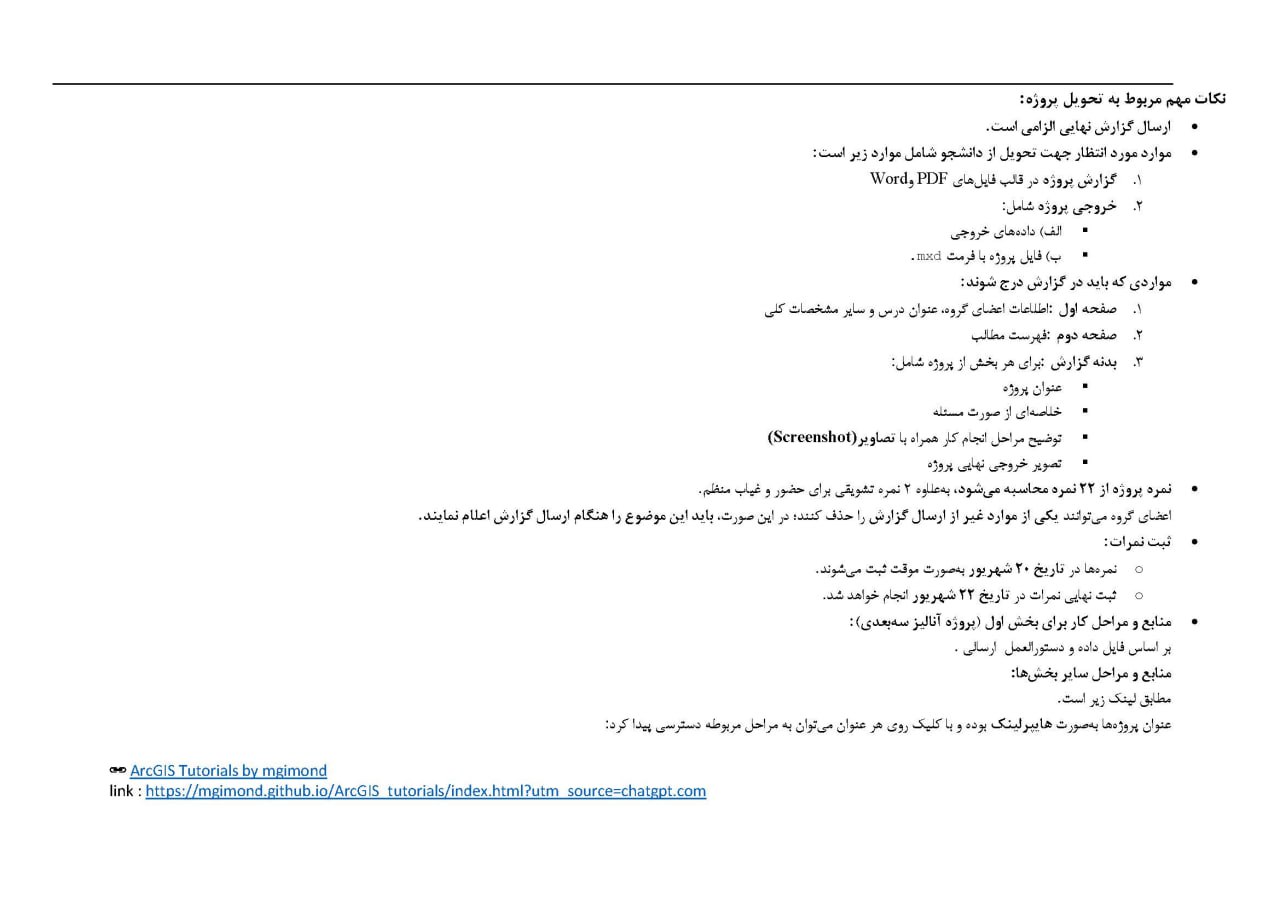 پروژه gis سلام در رابطه با پروژه gis مزاحمتون شدم دوتا پروژه برای انجام داشتم میخواستم ببینم میتونید انجام بدید؟ نرم افزار arc gis هست دوتا پروژه دانشگاهی هست برا انجام. زمانمون هم کمه تا فردا صبح پروژه شماره ۲ و ۳ هست که باید در قالب یک گزارش که داخل فایل ذکر شده تحویل داده بشه این دو پروژه هست به صورت جدا گانه مه اون موارد آبی رنگ که ذکر شده رو باید انجام بدیم در گزارش نهایی هم باید این موارد رو بیاریم