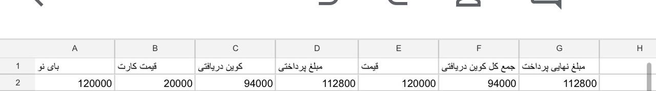 #کدپروژه: 101092 موضوع : گوگل شیت / هزینه ساخت فایل گوگل شیت چقدره؟ اولین چیز قیمت بای نو که عددش منهای 5% میشه بعدش منهای سلول B یعنی قیمت کارت میشه 120.000-5%-20.000 جوابش تو سلول بعدی یعنی بخش کوین دریافتی نوشته میشه که تو عکسم مشخص است کوین دریافتی * یک قیمت میشه که روزانه به صورتی دستی وارد میشن مثل بقیه به طور مثال قیمت بر اساس واحد 100.000 یا 100k حساب میشه مثلا برای 100k قیمت اگه 1 میلیون باشه مبلغ پرداختی میشه 940.000, حالا من چند تا کارت میزنیم همینجوری که مبلغ پرداخت نهایی تو یک سلول جدا در اخر مشخص شه نمونه اکسلش هست قدیمیه جدید میخام و گوگل شیت