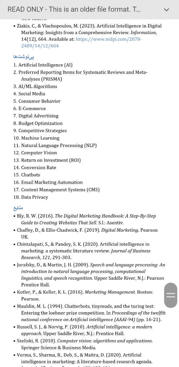 سلام یک فایل دارم میخوام پی نوشت ها بیارید تمام صفحه شکل ها رو درست کنید وجداول وفونت وهر مشکلی داره پی نوشت ها را بیارید مدل هم بر اساس عکسی که فرستادم مدلprisma در قسمت روش تحقیق یک فایل دارم میخوام پی نوشت ها بیارید تمام صفحه شکل ها رو درست کنید وجداول وفونت وهر مشکلی داره فقط مقاله را جایی نفرستین زمان ومبلغ مدلش بر اساس مدلprisma #phd candidate