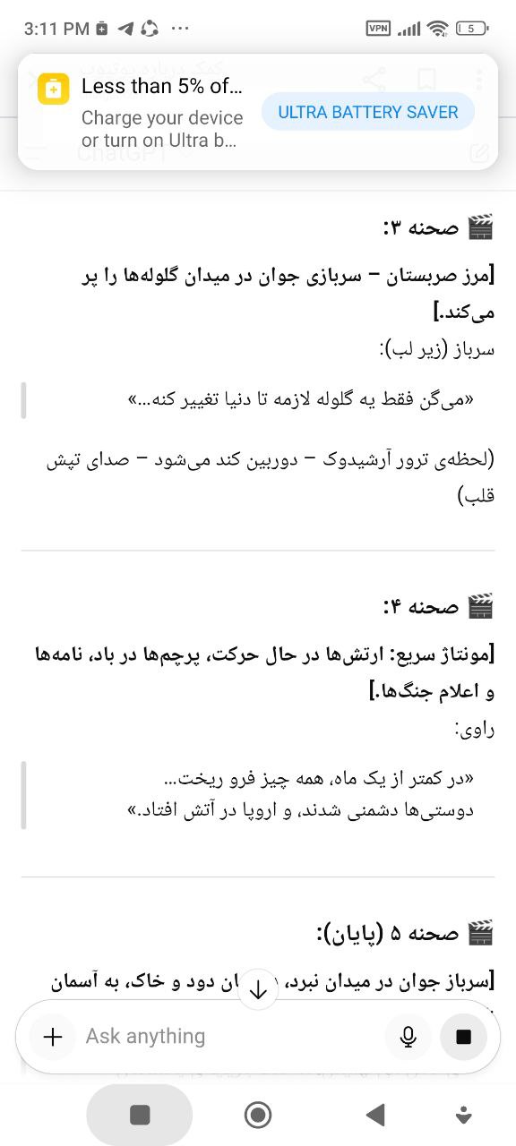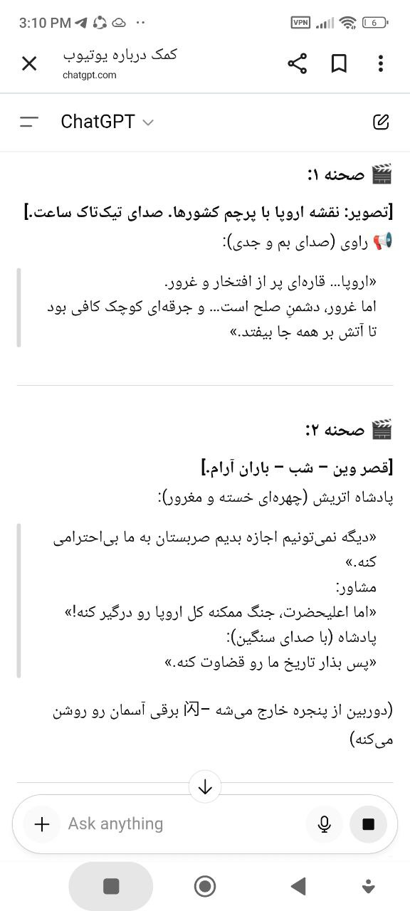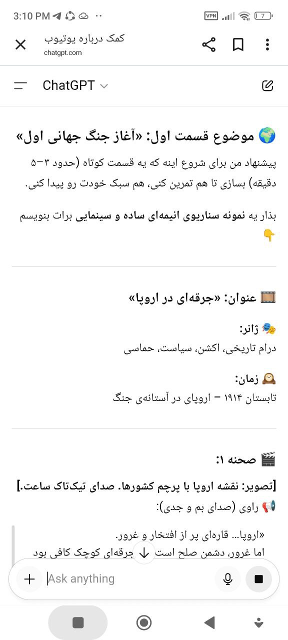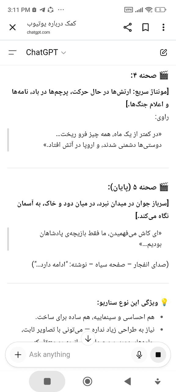 درود و ارادت سلام ساخت ی انیمیشن ۵ دقیقه ای چقدر هزینه داره سناریوش هم براساس داستانهای شاهنامه من میخوام کانال یوتیوب بزنم خواستم از شما ی آمار قیمت بگیرم سناریو هنوز کامل نیس چون قسمت به قسمته تقریبا ۲۰ قسمت ۵ دقیقه ای هستش و اینکه ژانرش هم تاریخی احساسی و فانتزی هستش میانگین برای ساخت ی انیمیشن معمولی تو تایم فریم ۵ دقیقه حدودی میتونی بگی چقدر هزینه داره سناریو جنگ جهانی اول قسمت ۱