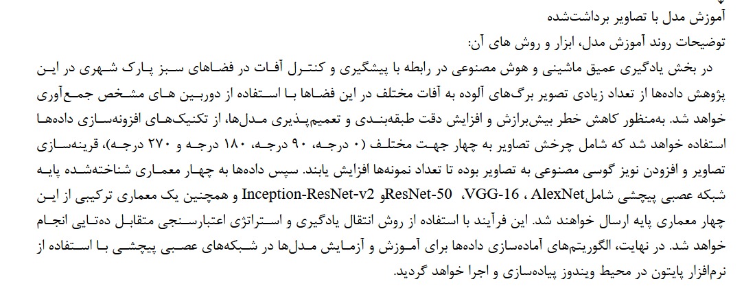 بابت ترینینگ داده های تصویری رشته من مهندسی فضای سبز هستش و یه بخشی از پایان نامه ام در رابطه با کنترل و پیشگیری آفت ها و بیماری های فضای سبز می باشد این متن بخشی از پروپوزال پایان نامه ام هستش قصد من به این صورت که عکس گیاه بیمار یا آلوده به آفت برداشت میشه بعد یه سری توضیحات تخصصی و گیاه پزشکی من برای اون آفت یا بیماری می نویسم و یا به عبارتی برای درمانش نسخه می نویسم قصد دارم که در انتها این سیستم تشخیص آفات به صورت یه نسخه تحت وب یا یه اپلیکیشن ارائه بشه مدل های مشابهش توی باغبانی و زراعت وجود داره مثل برنامه Plantix از گیاه عکس گرفته میشه بیماریش تشخیص داده میشه در اخر یه متن در رابطه با کنترل این آفت داده میشه من قصد دارم مدلی مشابه همین مخصوص گیاهان فضای سبز درست کنم تمام منطق تخصصیش، گرفتن تصاویر و انتخاب تصاویر رو خودم انجام میدم و منطقش رو پایه ریزی میکنم و برای اجرای این کار اطلاعات خام رو در اختیار شما میزارم یه ددلاین 20 روزه دارم شما توانایی انجام این کار رو در 20 روز دارید؟ و اینکه هزینه حدودیش چقدر میشه؟ هدف این پژوهش توسعه یک سامانه هوشمند تشخیص آفات و بیماریهای گیاهان فضای سبز است. در این سیستم، ابتدا از گیاهان مشکوک به آلودگی یا بیماری عکسبرداری میشود. سپس بر اساس تصاویر ثبتشده، توضیحات تخصصی گیاهپزشکی در مورد نوع آفت یا بیماری و روشهای کنترل و درمان آن ارائه خواهد شد؛ بهعبارتی، سامانه نوعی «نسخه درمانی» علمی برای گیاه صادر میکند. در مراحل نهایی، این مدل بهصورت یک نرمافزار تحت وب یا اپلیکیشن قابلدسترسی طراحی خواهد شد. نمونههای مشابه این فناوری در حوزه کشاورزی و باغبانی وجود دارد؛ برای مثال، برنامه Plantix از طریق تحلیل تصویر، بیماری گیاه را شناسایی کرده و راهکارهای کنترل آن را پیشنهاد میدهد. در این طرح، تمرکز بر طراحی مدلی مشابه اما ویژهی گیاهان فضای سبز شهری است. تمامی مراحل از جمله انتخاب و ثبت تصاویر، تدوین منطق تخصصی تشخیص و تحلیل دادهها توسط پژوهشگر انجام خواهد شد و دادههای خام جهت پیادهسازی و آموزش مدل در اختیار تیم اجرایی قرار میگیرد. نهایت سعیم رو کردم ساده توضیح بدم 0429 *