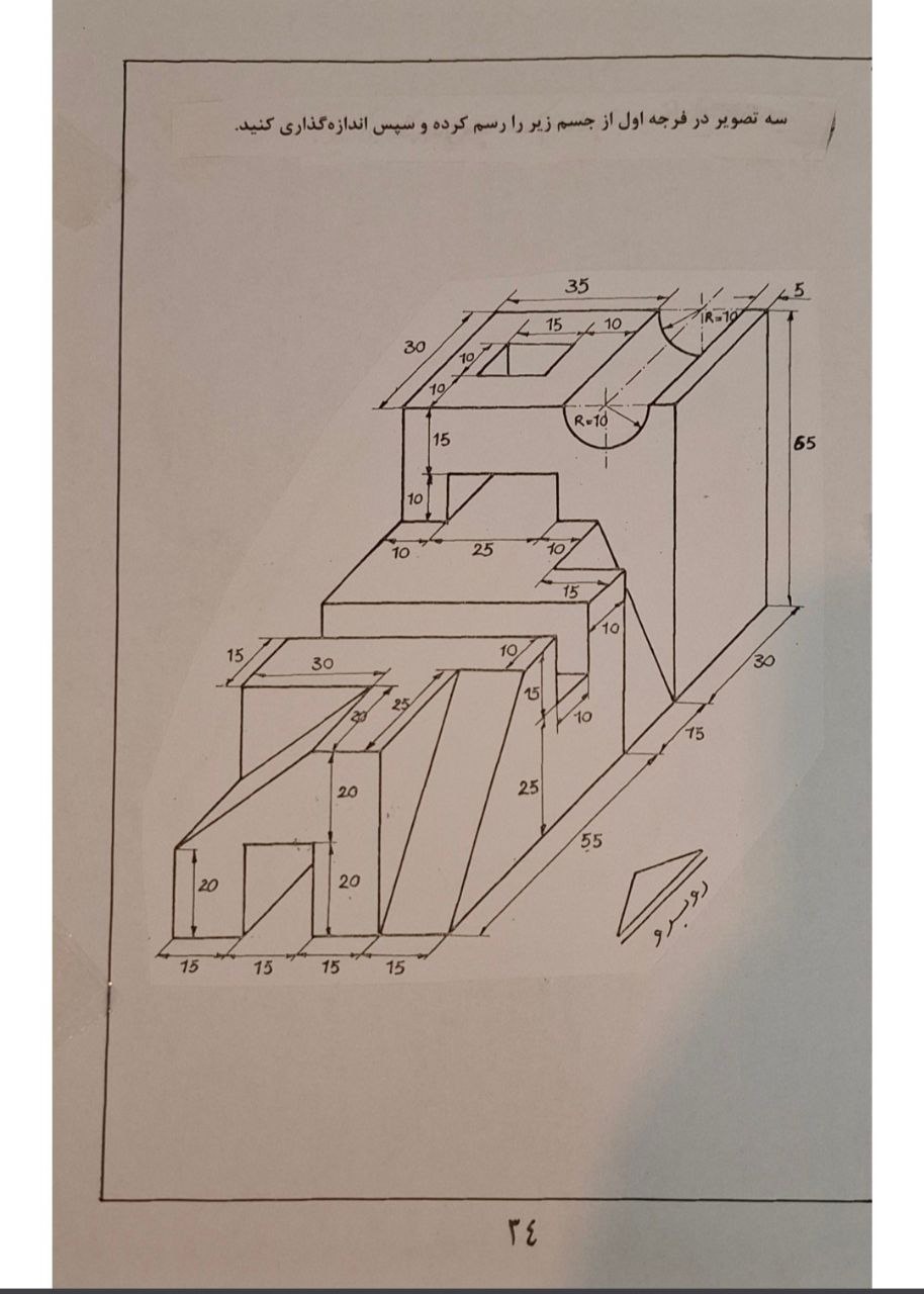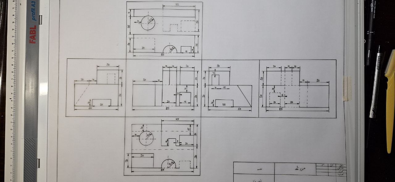 سلام و عرض ادب خدمت شما بزرگوار وقت بخیر عذرخواهی میکنم مزاحم اوقات میشم جسارتا میتونم از حضورتون بپرسم شما عزیزان پروژه های نقشه کشی دانشگاهی رو هم محبت میکنین؟ بسیار متشکرم از محبتتون واقعا لطف بزرگی میکنین☺️ ما باید این شکل رو از نماهای روبهرو، بالا و چپ داخل محور مشخص کنیم. نمای روبهرو با فلش مشخص شده طبق صحبت استاد، خطوط قابل دید با خط های پر و خطوط پنهان با خط چین مشخص میشه. همچنین این شکل رو باید یکبار با صفحه جبهی، با فاصله 20mm از پشت و 40mm از جلو برش بدیم و یکبار با صفحه نیمرخ با فاصله 15mm از راست و 85mm از چپ برش بدیم با قوائدی که داره من یه نمونه از کار کشیدم اما میخواستم از تجربه شما عزیزان استفاده کنم و مطمئن بشم که آیا درست هستش که شکل دقیق رو رسم کنم در واقع نماها و خطوط و هاشورهایی که دارن رو به طور کلی، بدون اندازه گیری میخواستم ببینم چطور میشن جسارتا نهایت تا شنبه شب زمان دارم که کامل کار رو آماده کنم متاسفانه من درست متوجه نحوه تدریس استاد نمیشم، به همین خاطر قوائد رو دقیقا نمیدونم چطور باید رعایت کنم مثل خط چین ها یا هاشورها در برش شکل فقط عذرخواهی میکنم بی ادبی میکنم میتونم بپرسم حدودا چقدر زمان میبره و چقدر هزینه داره این کار؟ نه فکر نمیکنم نیاز به نرم افزار باشه چون ما هم باید دستی روی کاغذ و کالک طرح رو بکشیم فقط میخواستم به طور کلی متوجه بشم که شکل چطور دیده میشه و کجا باید چه نوع خطوطی استفاده کنم دقیقا مهلت : دو روز
