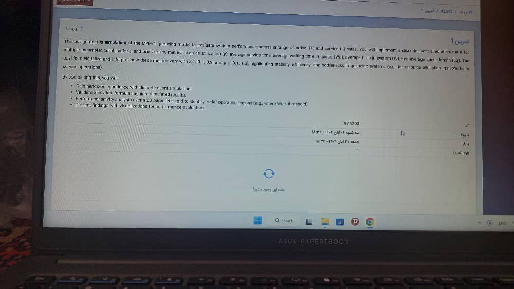 یه تمرین برای درس شبکه های کامپیوتری پیشرفته اختصاص داده شده که یک نمره ای هست و تاپایان آبان فرصت داره میتونسدانجامش بدید؟ این یک تمرین یک نمره ای هست اینو میتونید برام انجامش بدید؟ This assignment is simulation of the M/M/1 queueing model to evaluate system performance across a range of arrival (λ) and service (μ) rates. You will implement a discrete-event simulation, run it for multiple parameter combinations, and analyze key metrics such as utilization (ρ), average service time, average waiting time in queue (Wq), average time in system (W), and average queue length (Lq). The goal is to visualize and interpret how these metrics vary with λ ∈ [0.1, 0.9] and μ ∈ [0.1, 1.0], highlighting stability, efficiency, and bottlenecks in queueing systems (e.g., for resource allocation in networks or service operations). By completing this, you will: Gain hands-on experience with discrete-event simulation. Validate analytical formulas against simulated results. Perform sensitivity analysis over a 2D parameter grid to identify "safe" operating regions (e.g., where Wq < threshold). Present findings with visualizations for performance evaluation. ۳۰آبان پایتون یا جاوا 2714